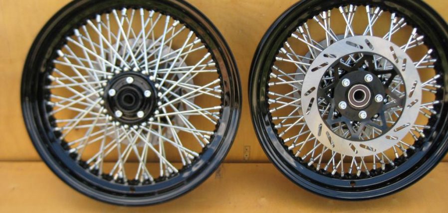 R-16 на 130-150 под дисковый тормоз. 80 спиц . Покрытие спиц -цинк. Возможно изготовление колес на спицах из нержавеющей стали. Переднее под 2 тормозных диска. Покраска колес -Акрил. Диаметр тормозного диска 240 мм. Возможное изготовление колес под вашу вилку на любой мотоцикл.